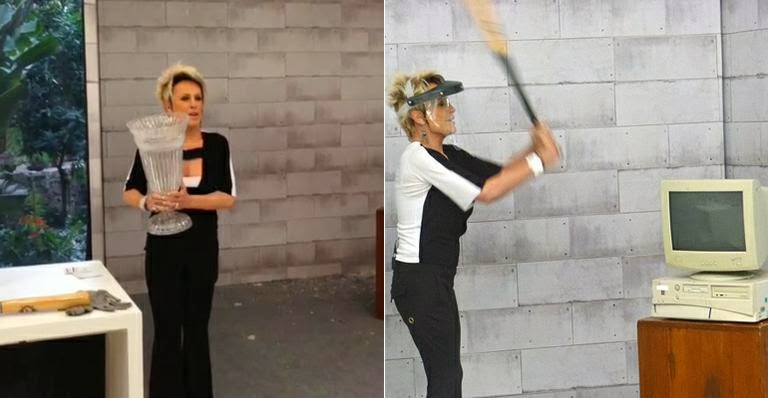Ana Maria Braga devidamente protegida, quebrou um vaso contra a parede, uma tampa de vidro e também deu marretadas em um computador durante a exibição da atração que vem atingindo bons índices de audiência para a Globo.